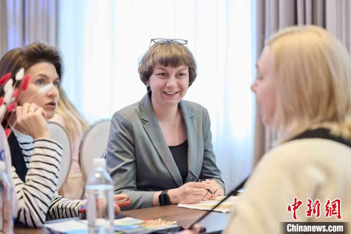 2025年3月,安娜斯塔西婭(左二)在莫斯科參加海南文旅推廣活動,與當?shù)芈眯猩探涣鳌?受訪者 供圖)
