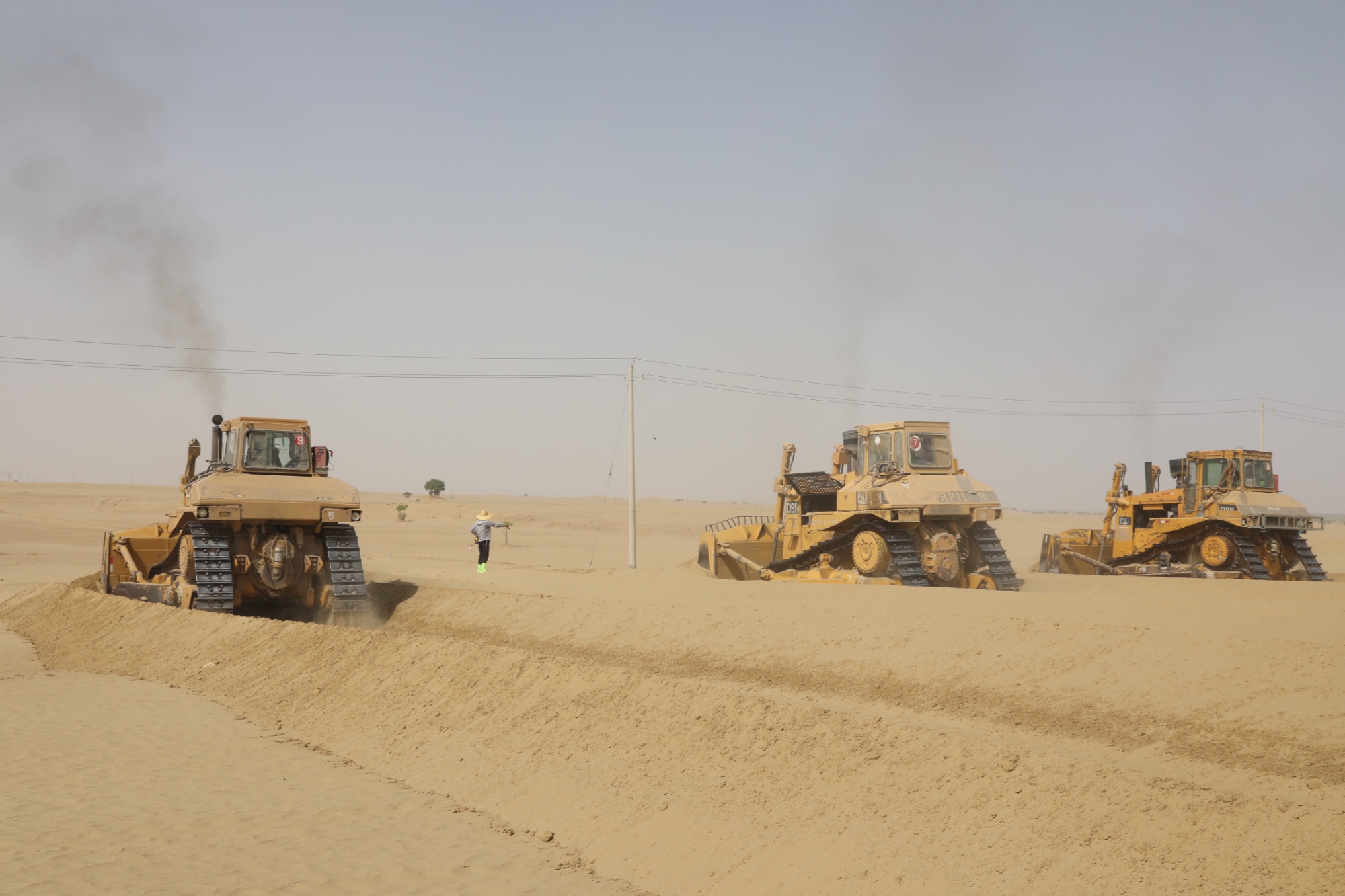 防沙治沙項目現(xiàn)場,大型機械正在平整沙漠 (日孜完古麗·買吐地 攝)