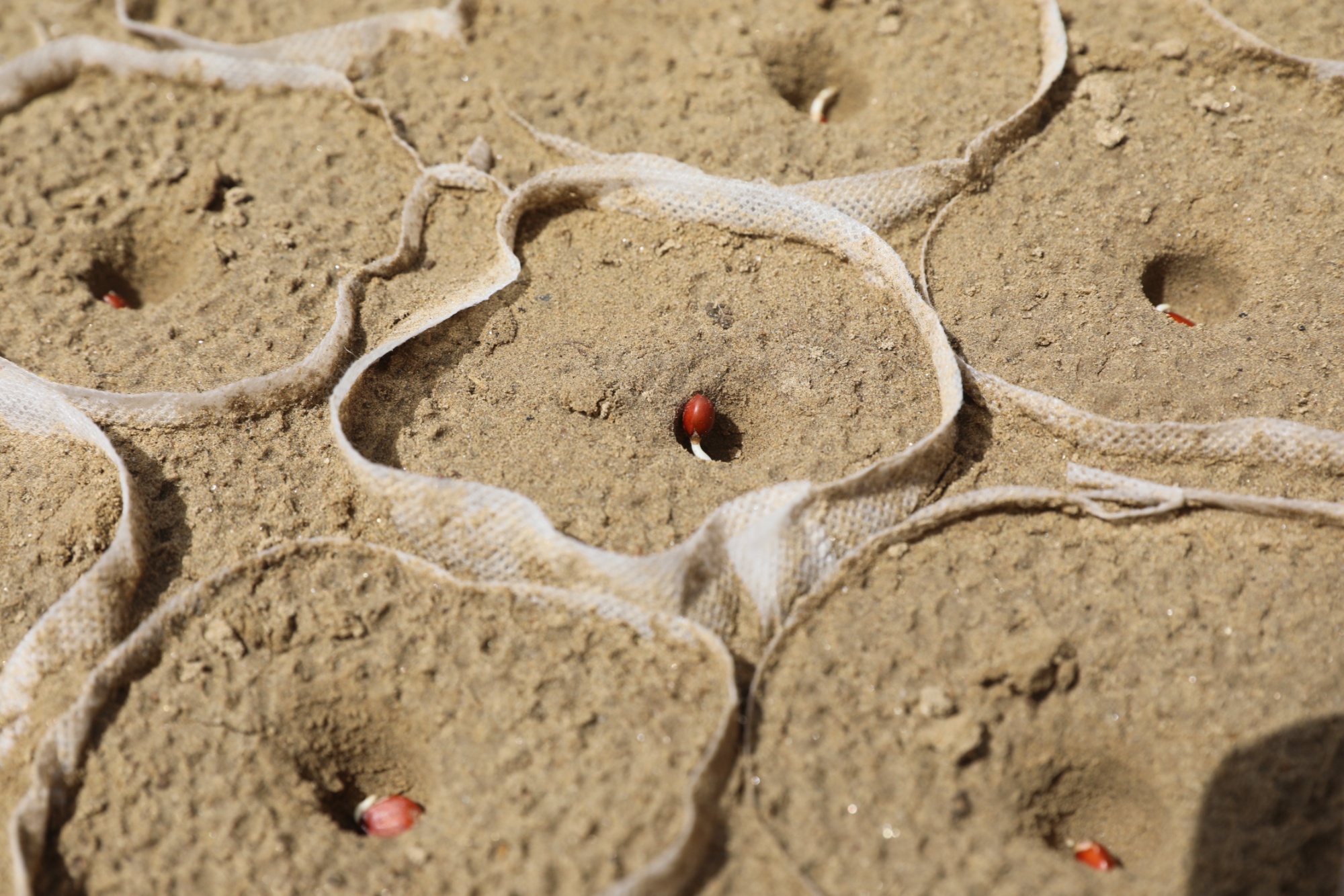 播種前,土地經(jīng)過改良,混合化肥與羊糞的有機肥料被均勻撒入沙土,再裝入育苗袋。在育苗袋里播種后,工作人員澆水、埋土、覆膜、搭建拱棚,確保幼苗在防風(fēng)保溫的環(huán)境中茁壯成長。