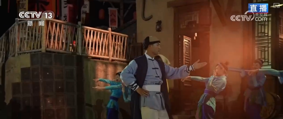 實(shí)際上,這處街道只是整場(chǎng)演出中的一幕。游客隨演員一路向前,長(zhǎng)達(dá)1個(gè)小時(shí)的劇情講述了百年前一名外國(guó)導(dǎo)演來(lái)到鄭州,尋找太極的故事。其間,會(huì)串聯(lián)起景區(qū)的不同場(chǎng)景,比如走過(guò)繁華的“老鄭州”街道,后面就變成了一個(gè)古樸的村落。置景取材于太極拳發(fā)源地之一的河南焦作陳家溝,村里既有講述拜師學(xué)藝故事的情景劇,又有以太極功夫編排的舞蹈表演,體現(xiàn)出中原地區(qū)的多樣歷史文化。