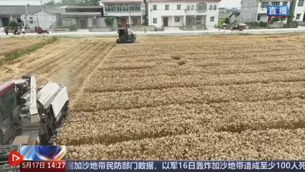 重慶潼南區(qū)八角村的小麥種植基地連片種植的小麥有600多畝,現(xiàn)在小麥從麥稈到麥穗都已經(jīng)變成金黃色,麥粒兒也十分硬實,小麥已完全成熟。這兩天天氣很好,三臺收割機正在同步收割,預計5小時左右就能完成這一片200多畝小麥的收獲。與人工收割相比,效率提升了50倍左右,這些收獲了的小麥馬上就會被送到烘干廠進行烘干,然后被打磨成面粉,制作重慶人最愛的重慶小面。