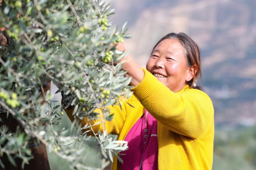 在甘肅省隴南市武都區(qū)一處油橄欖種植基地,農戶采摘油橄欖鮮果。新華社記者 郎兵兵 攝