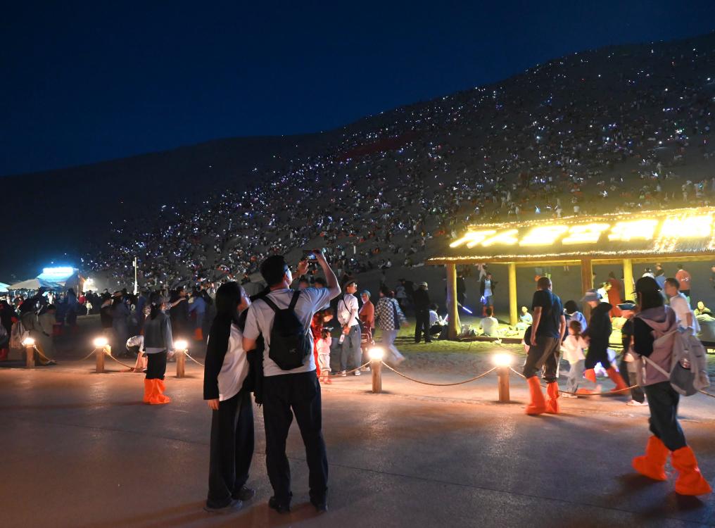 5月1日晚,游客在甘肅省敦煌市鳴沙山月牙泉景區(qū)參加萬人星空演唱會。新華社發(fā)(張曉亮攝)
