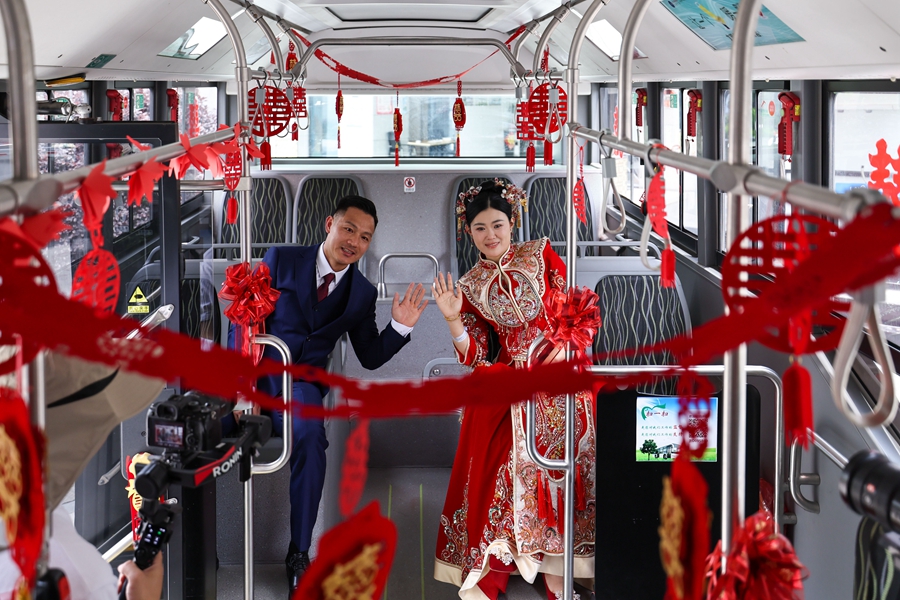 2025年4月30日,“愛(ài)情巴士”搭載著新郎新娘前往浙江諸暨市同山鎮(zhèn)唐仁村祠堂進(jìn)行婚禮儀式。新華社記者 江漢 攝