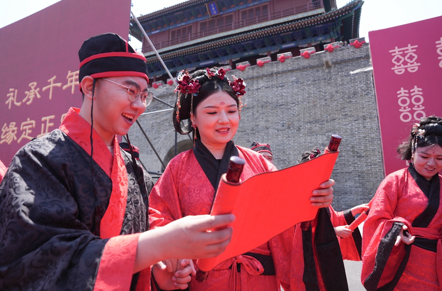 2025年5月17日,在河北省石家莊市正定古城舉行的集體婚禮上,一對(duì)新人在閱讀婚書(shū)。新華社發(fā)(梁子棟攝)
