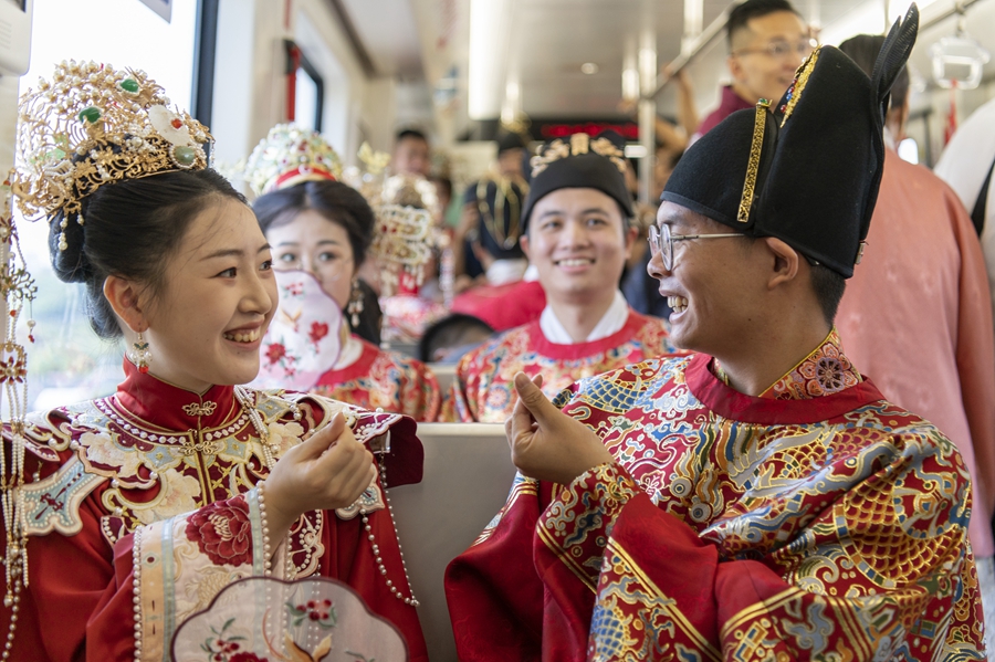 2024年8月10日,新人參加由浙江省金華市民政局與金華市軌道交通集團(tuán)有限公司聯(lián)合舉辦的“緣起金軌、愛(ài)在七夕”集體婚禮。新華社發(fā)(胡肖飛攝)