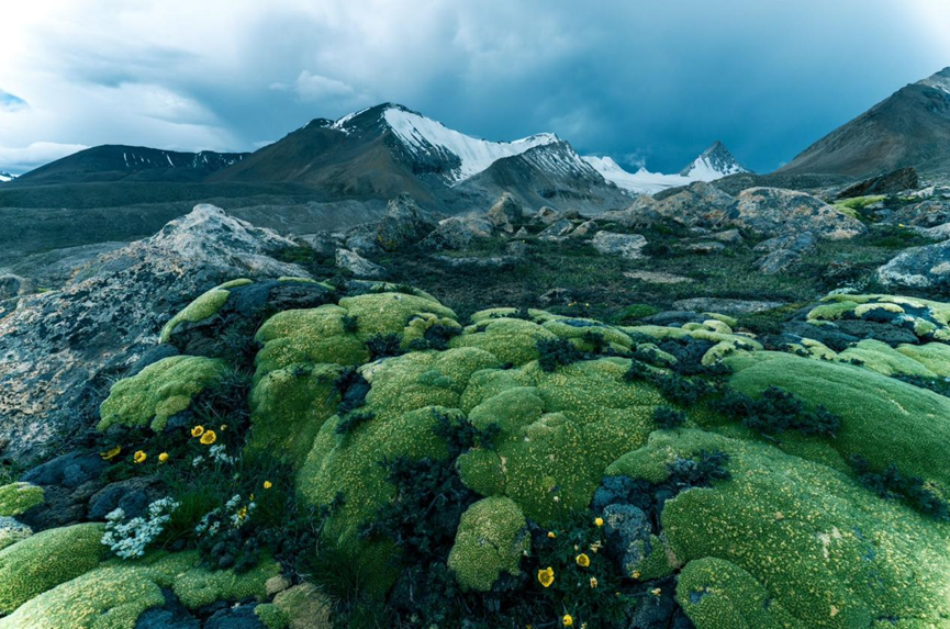 第二天一早,我們繼續(xù)向山脈的腹地去探索,前往冷布崗日腹地的道路也是無人踏足的,沒有正規(guī)車道的,所以我們同樣只能沿著牧民留下的車轍印前行。在一望無際的高原上,我們找不到路的時候就操縱無人機升空去探索路線。經(jīng)過了一整天的艱難探索,終于抵達了目的地,這個地方再往上走是完全沒有路了。在海拔約5800米左右的這個地方,不僅有巍峨壯美的雪山,還長著很多這種獨特的高山苔蘚,這種植被通常只分布在海拔4000米以上的地區(qū),極具地域特色。所以在拍攝時,我將這些高原特有的植被作為前景,既展現(xiàn)了高原生態(tài)風貌,也作為海拔高度的天然標識,然后遠處雄偉的冷布崗日雪山則構(gòu)成了畫面的核心部分。