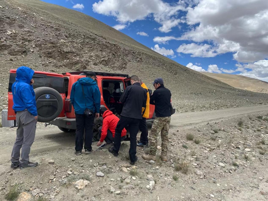▲李冬一行在高原上更換車胎(受訪者供圖)