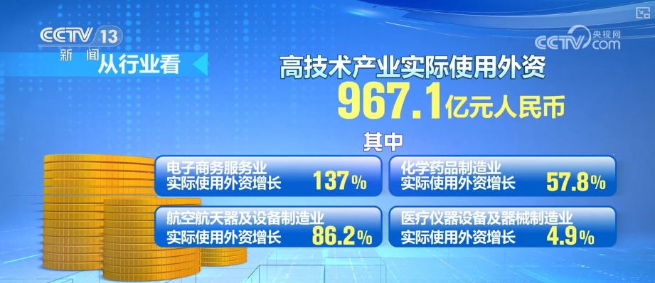 其中,電子商務服務業(yè)、航空航天器及設備制造業(yè)、化學藥品制造業(yè)、醫(yī)療儀器設備及器械制造業(yè)實際使用外資分別增長137%、86.2%、57.8%和4.9%。