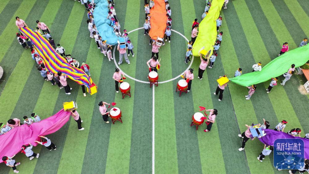 5月23日,在山東省東營(yíng)市廣饒縣李鵲鎮(zhèn)中心幼兒園,小朋友在進(jìn)行龍舟賽游戲(無(wú)人機(jī)照片)。新華社發(fā)(劉云杰攝)