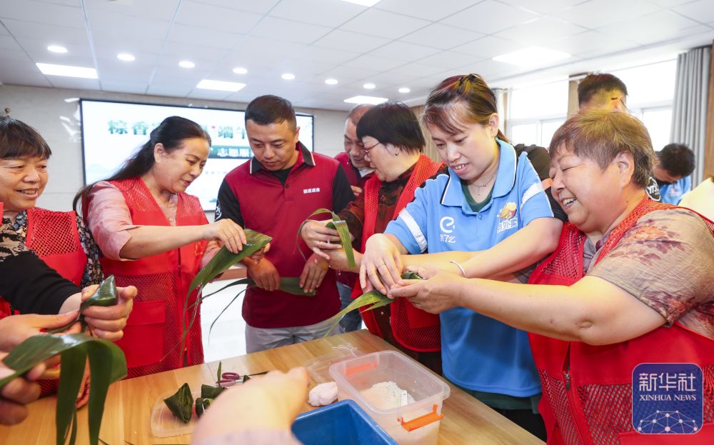 5月23日,江蘇省淮安經(jīng)濟(jì)技術(shù)開(kāi)發(fā)區(qū)的退休職工志愿者和快遞員一起包粽子。新華社發(fā)(趙啟瑞攝)