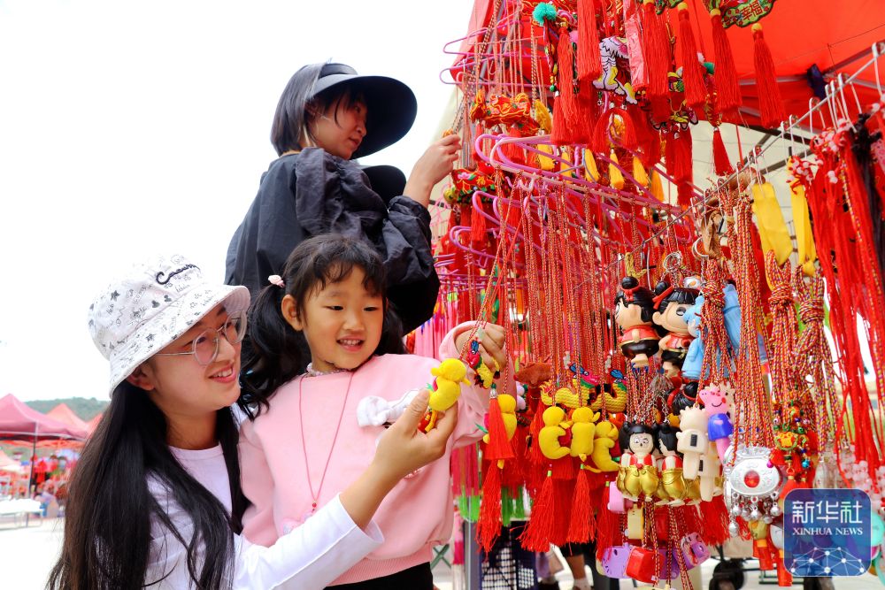 5月24日,在甘肅省平?jīng)鍪徐o寧縣成紀(jì)文化城廣場(chǎng),人們?cè)谶x購(gòu)香荷包。新華社發(fā)(王毅攝)