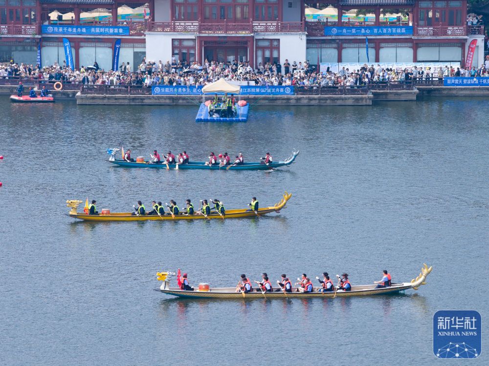 5月24日,龍舟隊(duì)在江蘇省南京市莫愁湖公園參加比賽(無(wú)人機(jī)照片)。新華社發(fā)(楊素平攝)
