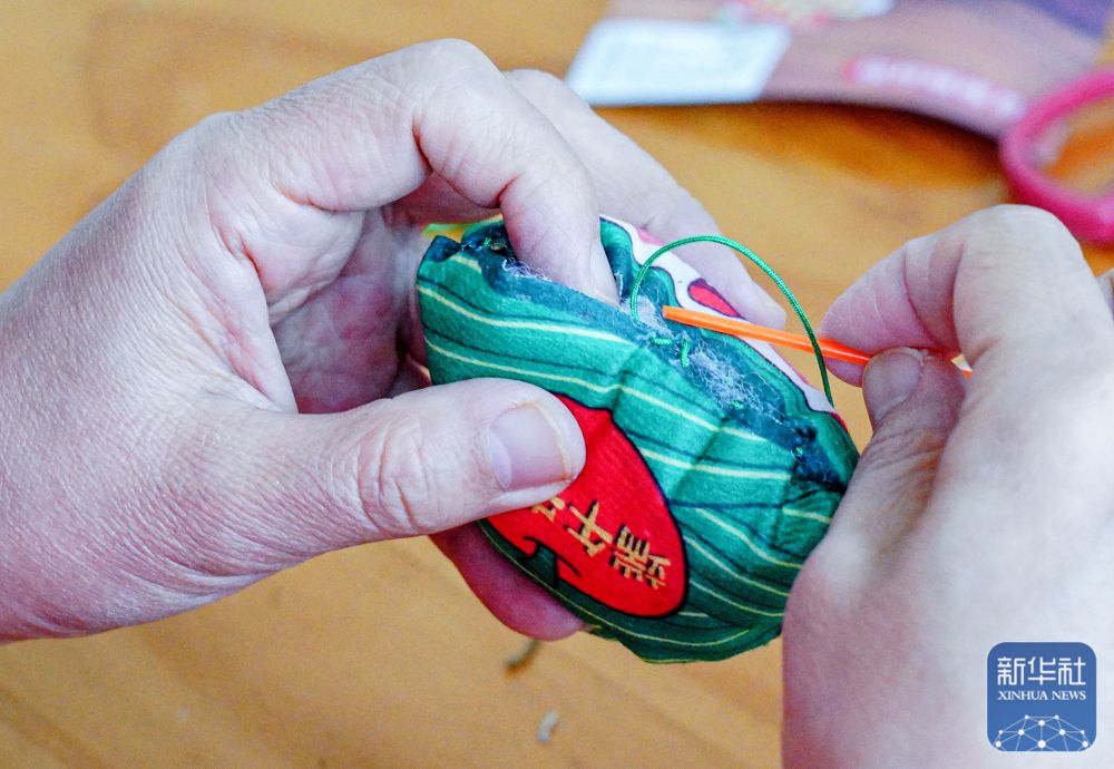 5月23日,志愿者在山東省榮成市新時(shí)代文明實(shí)踐中心制作香囊,準(zhǔn)備送給孤寡老人。新華社發(fā)(李信君攝)
