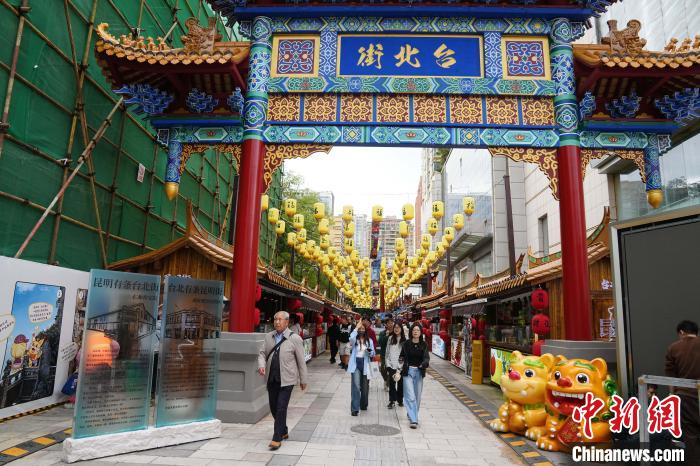 下午3點(diǎn)多,臺(tái)北街上已聚集不少食客,大腸包小腸、咸酥雞、旗魚(yú)黑輪、愛(ài)玉冰等美食琳瑯滿目。放眼望去,融合滇西古建筑特色的牌坊、源于閩南古厝的攤車(chē)商亭、來(lái)自臺(tái)中黃永阜老人的眷村彩繪,讓兩岸同根同源的文脈在此交匯。