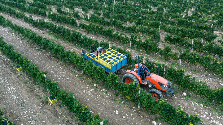 工人在寧夏沃爾豐釀酒葡萄種植基地轉(zhuǎn)運采摘下的釀酒葡萄(2024年9月19日攝,無人機照片)。
