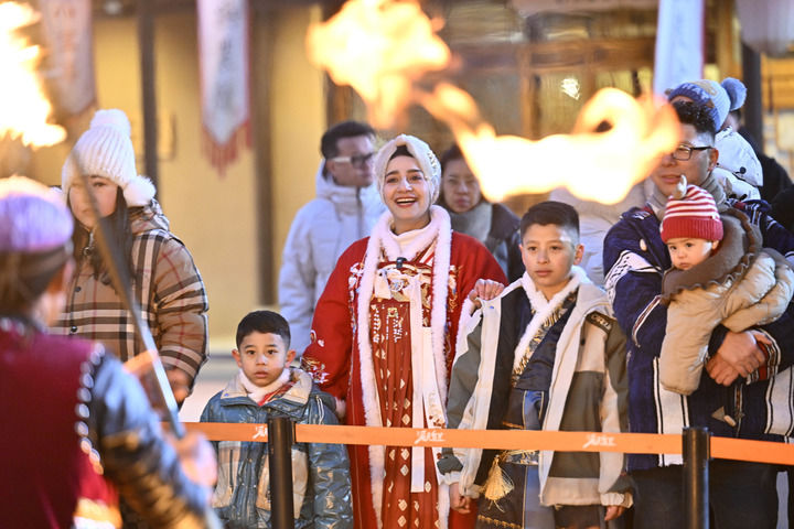 外國友人在“漫葡·看見賀蘭”沉浸式演藝小鎮(zhèn)內(nèi)觀看演出(2025年1月14日攝)。