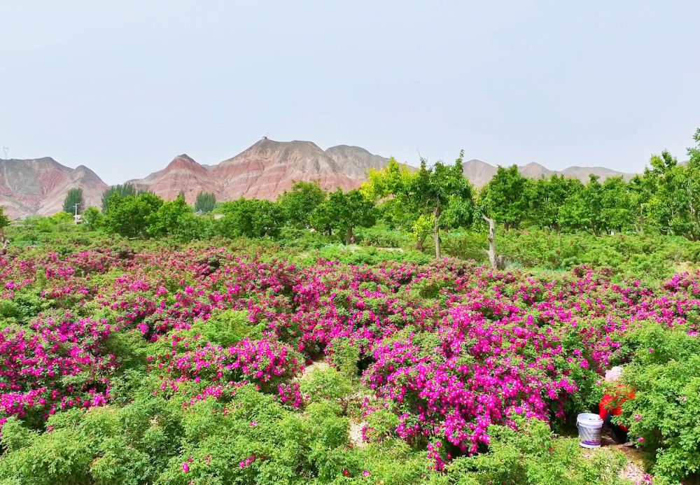 端午前后,大西北的溝梁山峁間,星星點(diǎn)點(diǎn)的綠意,才開(kāi)始像滴在紙上的玫瑰精油,一片一片串連起來(lái)、洇染開(kāi)來(lái)。苦水玫瑰的盛開(kāi)時(shí)節(jié),已經(jīng)到來(lái)。姹紫嫣紅的花朵、沁人心脾的花香,醉了這里的每條街巷。