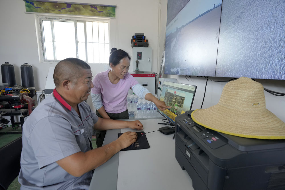 在山西省運城市鹽湖區(qū)解州鎮(zhèn)曲村,董會龍(左)和妻子范月親通過農(nóng)機精準作業(yè)平臺查看農(nóng)機手作業(yè)情況。董會龍夫妻是運城市鹽湖區(qū)解州鎮(zhèn)的種糧大戶。(5月27日攝)。