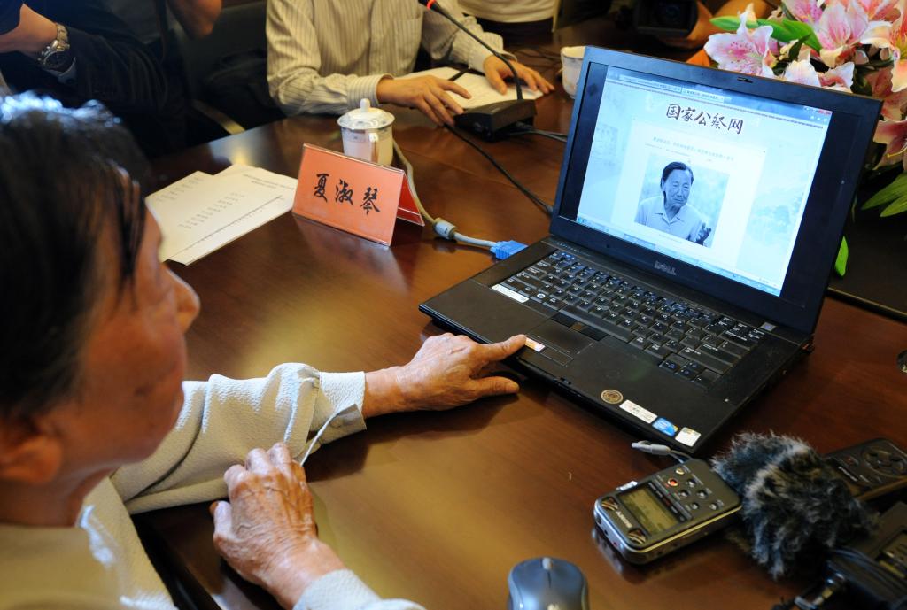 ↑2014年9月17日,夏淑琴點(diǎn)開(kāi)自己口述證言公布網(wǎng)頁(yè)。從當(dāng)日起,侵華日軍南京大屠殺遇難同胞紀(jì)念館連續(xù)100天每天在國(guó)家公祭網(wǎng)和紀(jì)念館官方網(wǎng)站上公布一位南京大屠殺幸存者口述證言。新華社記者 孫參 攝