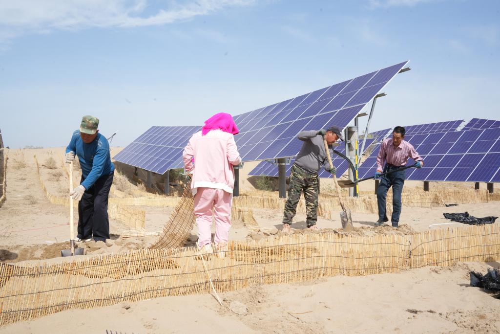 連日來,地處黃河“幾字彎”北岸的巴彥淖爾市臨河區(qū)新華林場(chǎng)光伏治沙項(xiàng)目區(qū)機(jī)器轟鳴,新華鎮(zhèn)隆光村村民吳瑞喜和其他村民利用夯土機(jī)打地基?!艾F(xiàn)在,我們種的小麥剛抽穗、玉米已澆水,村民們趁著農(nóng)閑到這里打工,一天能掙300元,大家參與防沙治沙的積極性都很高?!眳侨鹣舱f。