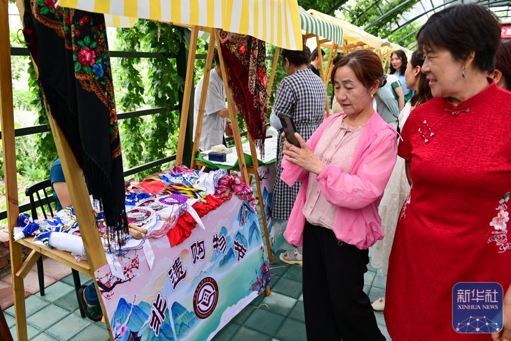 在新疆伊犁哈薩克自治州霍城縣解憂公主薰衣草園,游客在非遺集市游覽拍照(6月14日攝)。