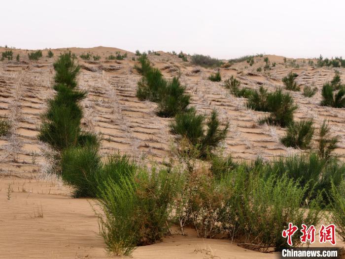 夏日驕陽(yáng)炙烤著九棵樹(shù)治沙項(xiàng)目區(qū),廣袤的沙地上,一排排整齊的草方格如同給沙丘上了“鎖鏈”,而這些被固定住的流沙,為植被生長(zhǎng)創(chuàng)造了重要條件。