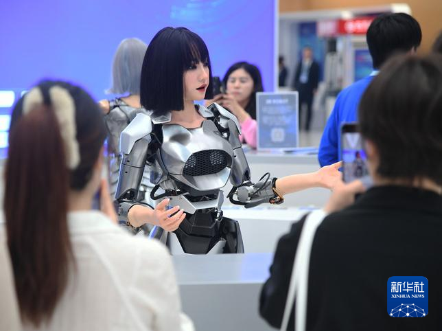 仿生人形機(jī)器人在2024中關(guān)村論壇年會(huì)會(huì)場(chǎng)設(shè)置的咨詢臺(tái)“迎賓”(2024年4月27日攝)。新華社記者 任超 攝