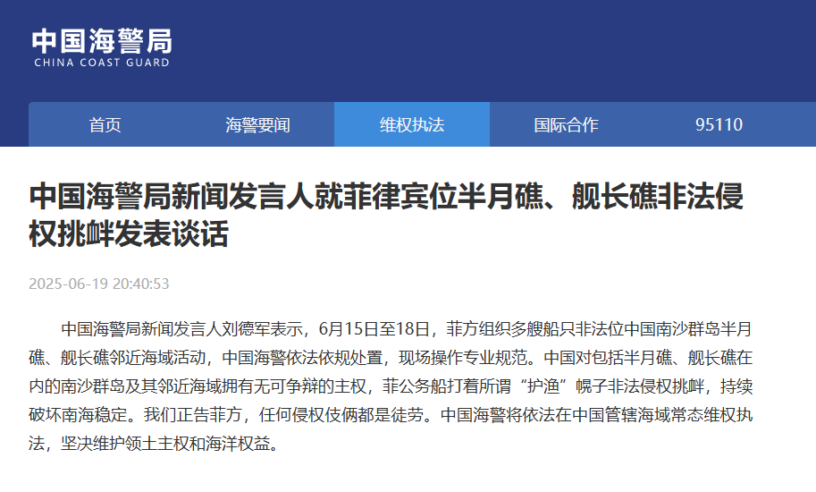 中國(guó)海警局新聞發(fā)言人劉德軍表示,6月15日至18日,菲方組織多艘船只非法位中國(guó)南沙群島半月礁、艦長(zhǎng)礁鄰近海域活動(dòng),中國(guó)海警依法依規(guī)處置,現(xiàn)場(chǎng)操作專業(yè)規(guī)范。中國(guó)對(duì)包括半月礁、艦長(zhǎng)礁在內(nèi)的南沙群島及其鄰近海域擁有無可爭(zhēng)辯的主權(quán),菲公務(wù)船打著所謂“護(hù)漁”幌子非法侵權(quán)挑釁,持續(xù)破壞南海穩(wěn)定。我們正告菲方,任何侵權(quán)伎倆都是徒勞。中國(guó)海警將依法在中國(guó)管轄海域常態(tài)維權(quán)執(zhí)法,堅(jiān)決維護(hù)領(lǐng)土主權(quán)和海洋權(quán)益。