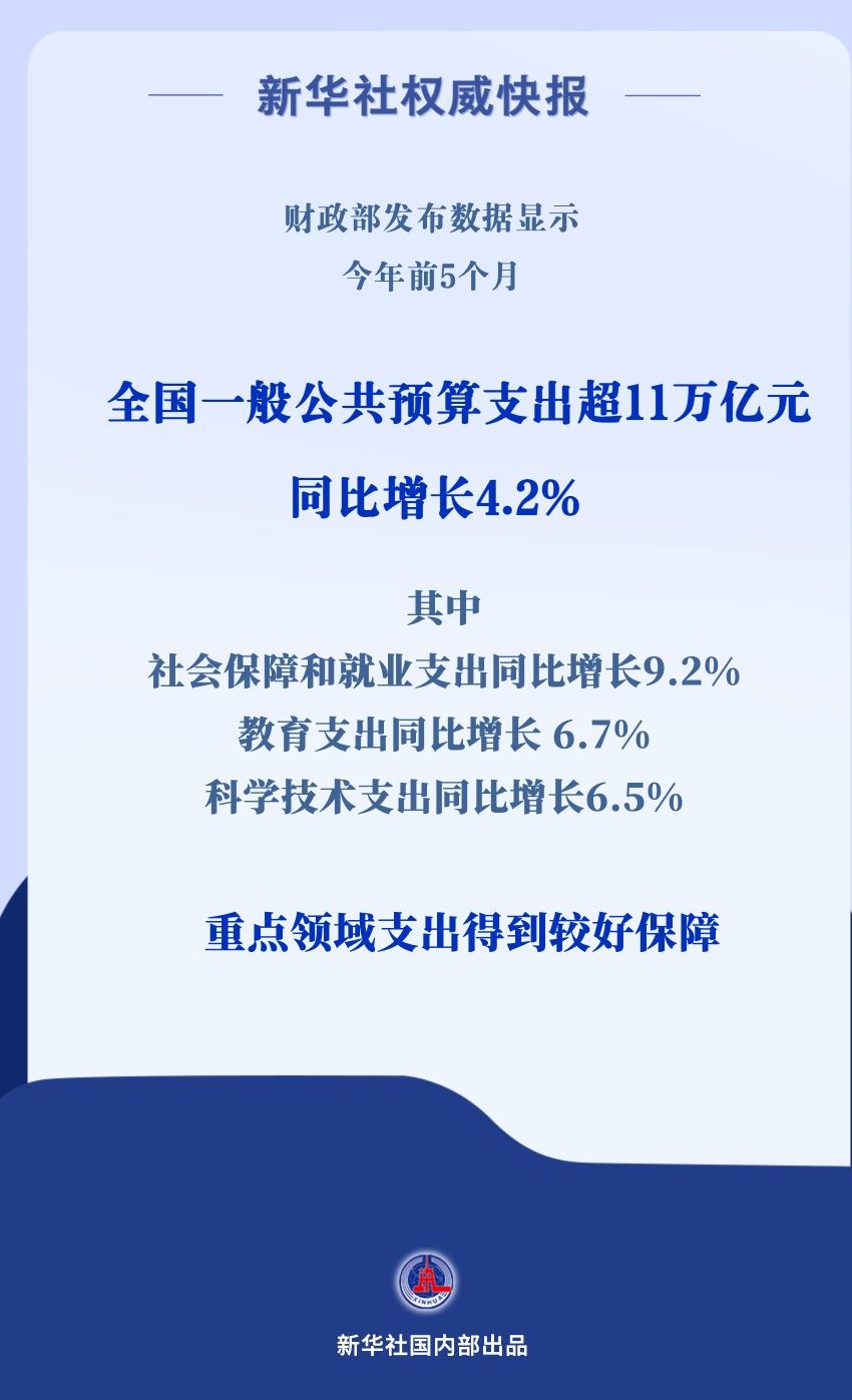 數(shù)據(jù)顯示,全國一般公共預(yù)算支出持續(xù)增長,前5個月達112953億元,同比增長4.2%。各級財政部門加大支出強度,優(yōu)化支出結(jié)構(gòu),持續(xù)加強對重點領(lǐng)域的支出保障。