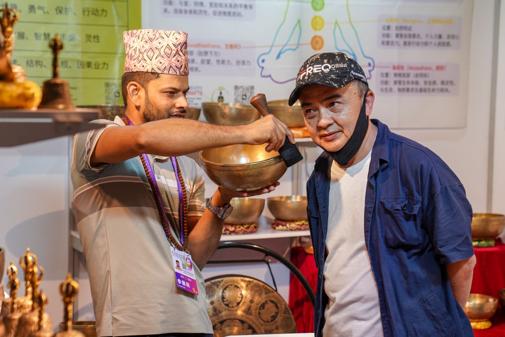 6月21日,顧客在南亞館尼泊爾展區(qū)體驗(yàn)頌缽。