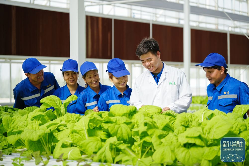 ↑ 6月25日,在新疆阿克蘇地區(qū)庫車市甬庫同心村智慧農(nóng)業(yè)植物工廠,技術(shù)人員在培訓(xùn)從當(dāng)?shù)卣衅傅霓r(nóng)業(yè)產(chǎn)業(yè)工人。
