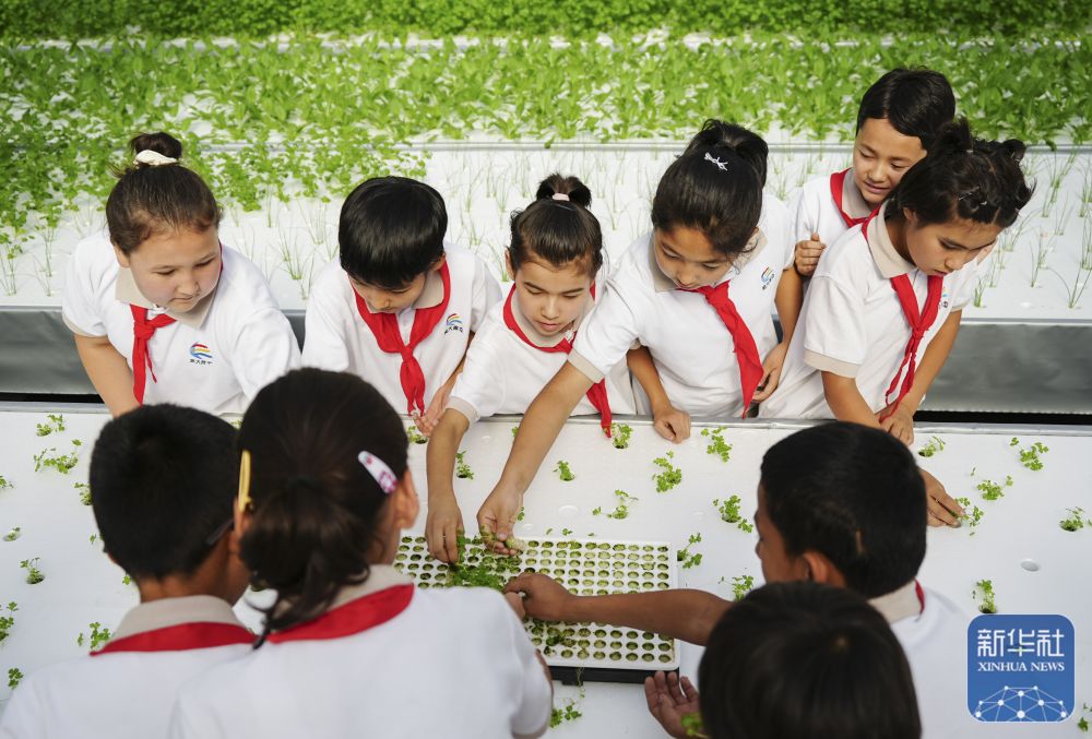↑ 6月25日,在新疆阿克蘇地區(qū)庫車市甬庫同心村智慧農(nóng)業(yè)植物工廠,當(dāng)?shù)匦W(xué)生體驗(yàn)無土栽培。