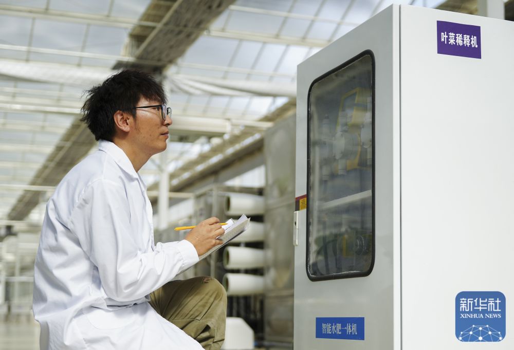 ↑ 6月25日,在新疆阿克蘇地區(qū)庫車市甬庫同心村智慧農(nóng)業(yè)植物工廠,工作人員在監(jiān)測(cè)記錄智能水肥一體機(jī)運(yùn)行情況。