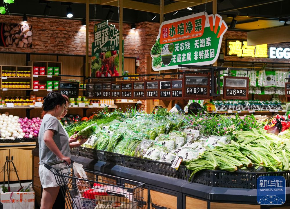 ↑ 6月25日,在新疆阿克蘇地區(qū)庫車市美連美超市,人們?cè)谶x購甬庫同心村智慧農(nóng)業(yè)植物工廠的農(nóng)產(chǎn)品。