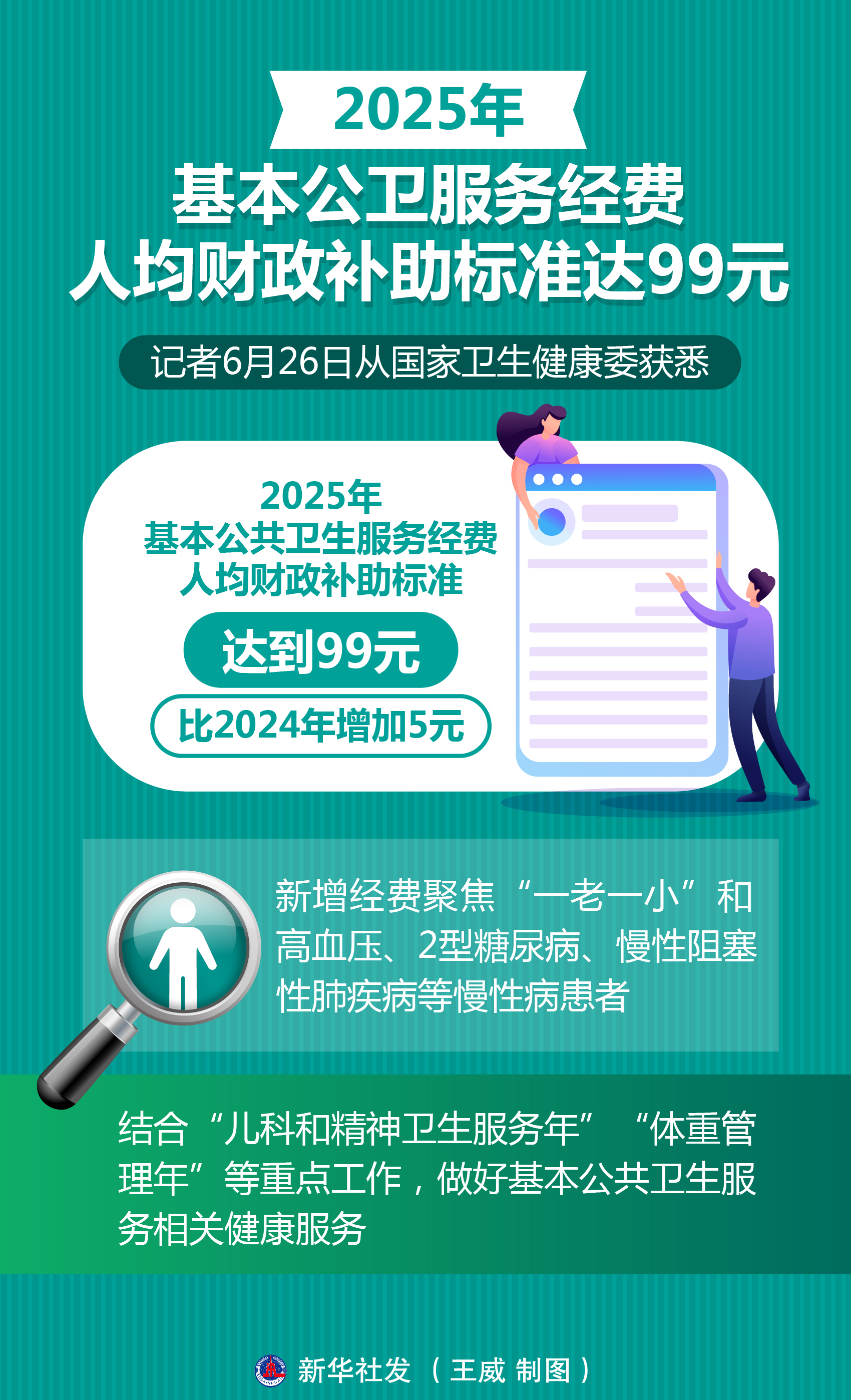 記者26日從國家衛(wèi)生健康委獲悉,2025年基本公共衛(wèi)生服務經費人均財政補助標準達到99元,比上年增加5元。