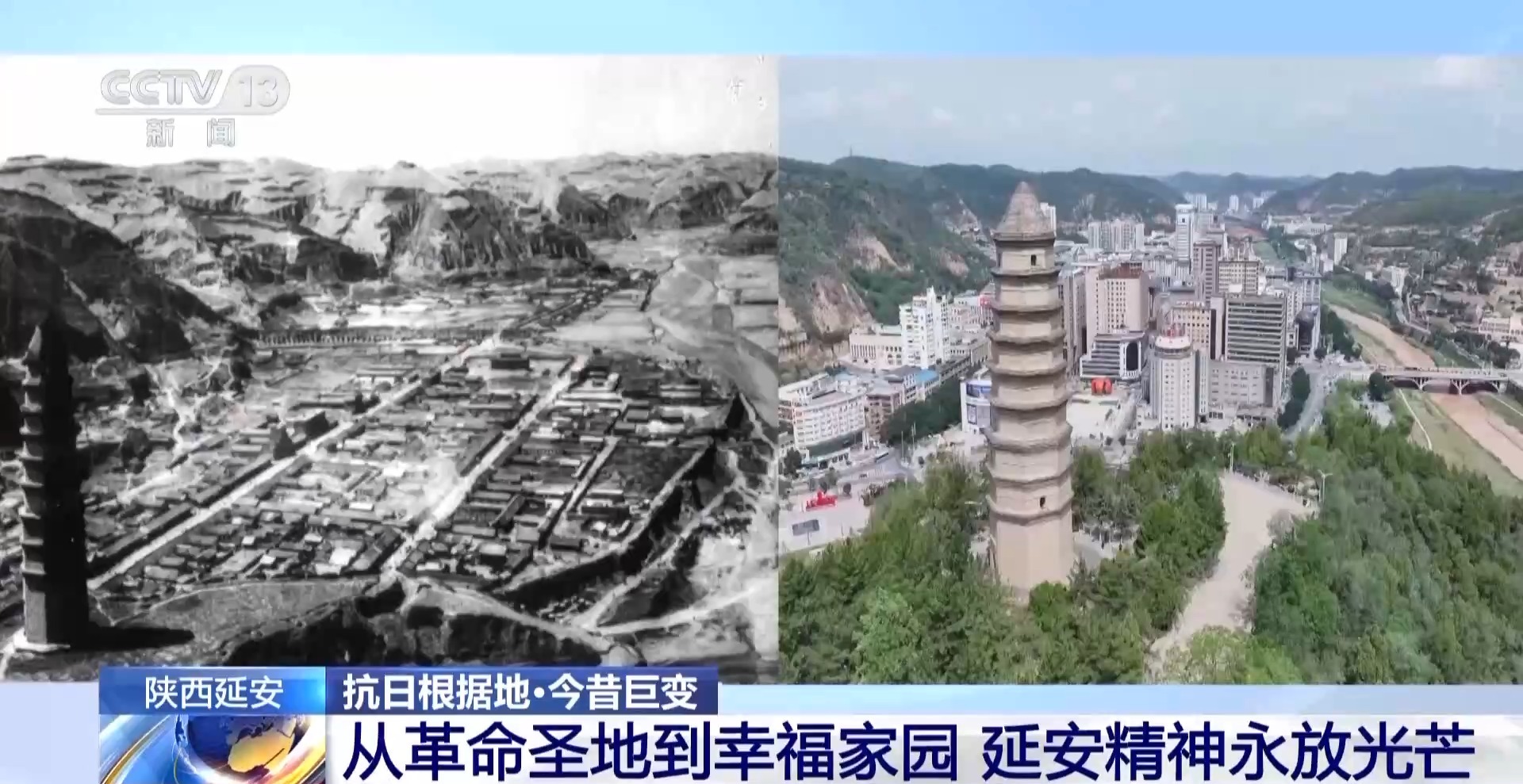 說到延安,很多人自然就會想到巍巍寶塔山,這張照片就是拍攝于80多年前的寶塔山上。當(dāng)時,城里大多是低矮的平房。如今從同一個位置俯瞰,這里已經(jīng)發(fā)生了翻天覆地的巨變——延河兩岸,高樓大廈拔地而起,鱗次櫛比的現(xiàn)代化新城矗立眼前。