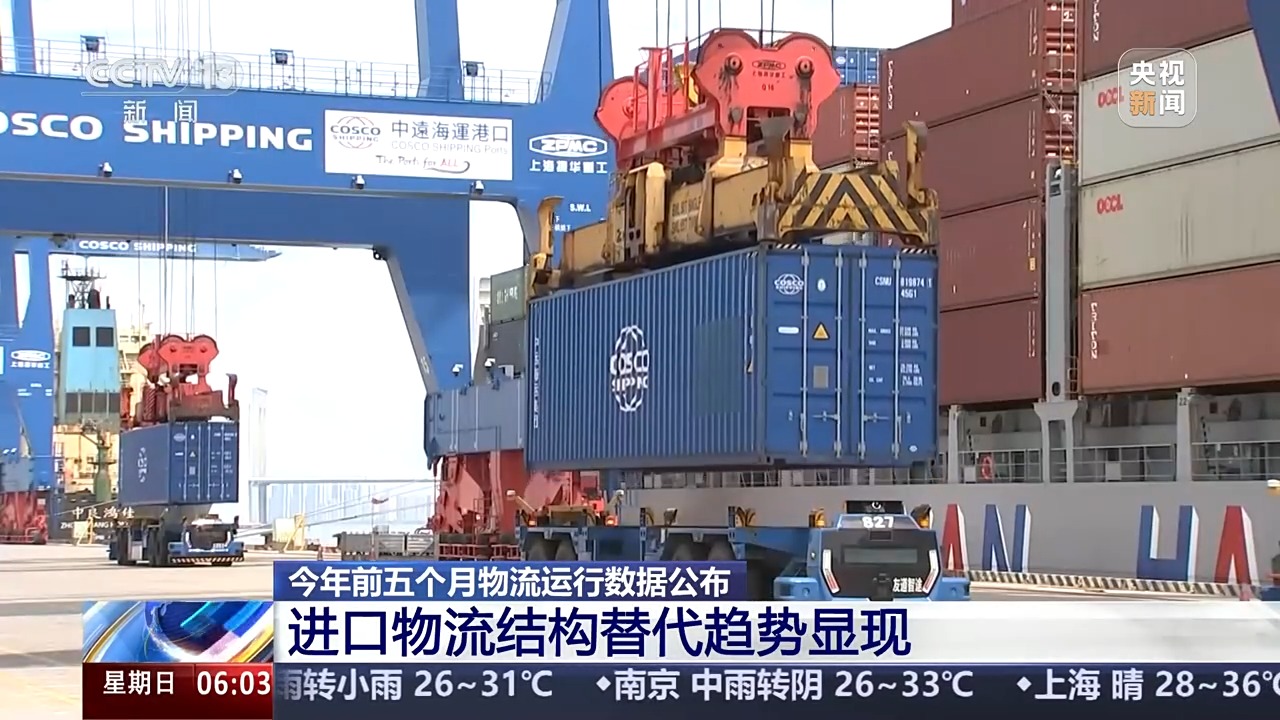1—5月份,進(jìn)口物流總額同比下降4.1%。