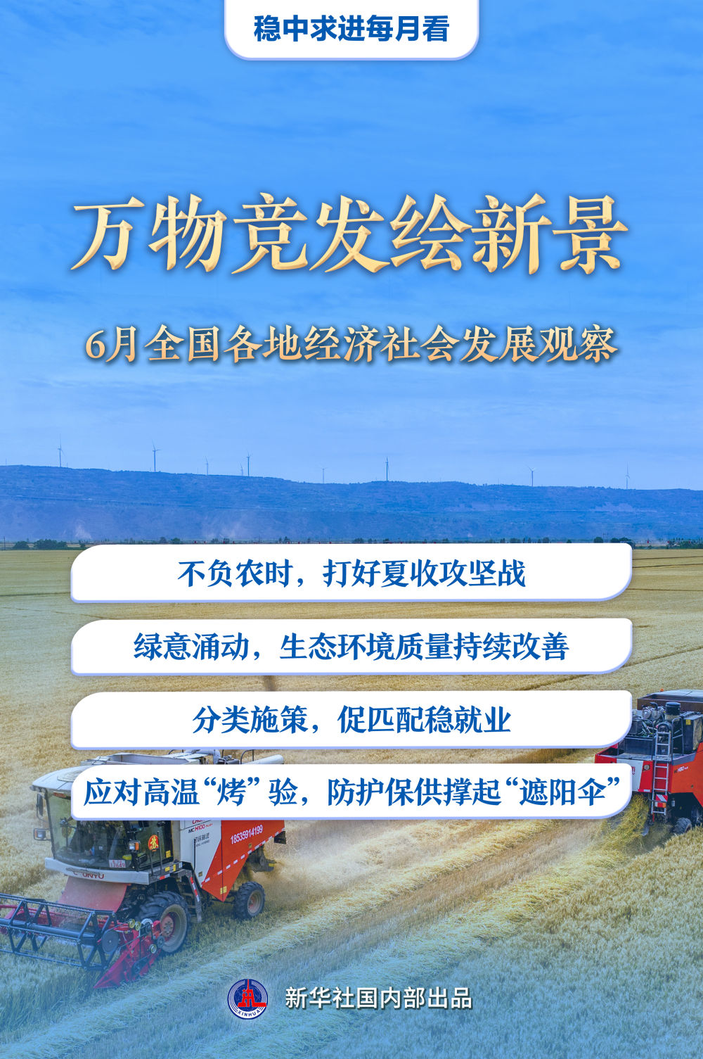 6月仲夏,萬物豐茂。廣袤農(nóng)田上,“三夏”生產(chǎn)進(jìn)入關(guān)鍵階段;綠水青山間,低碳發(fā)展不斷繪就新圖景;全力穩(wěn)就業(yè),政府、企業(yè)與高校同頻共振;高溫“烤”驗(yàn)下,做好各項(xiàng)保障工作……上半年收官之月,各地各部門統(tǒng)籌推進(jìn)穩(wěn)增長、促改革、惠民生舉措,推動經(jīng)濟(jì)社會沿著高質(zhì)量發(fā)展之路穩(wěn)步前行。