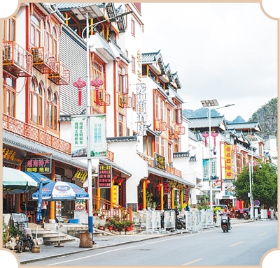 身著“奧黛”的中國游客在中越友誼街前留影。