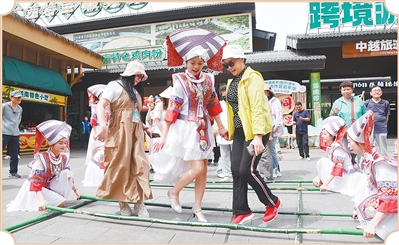 游客在中越德天(板約)瀑布跨境旅游合作區(qū)體驗民俗。