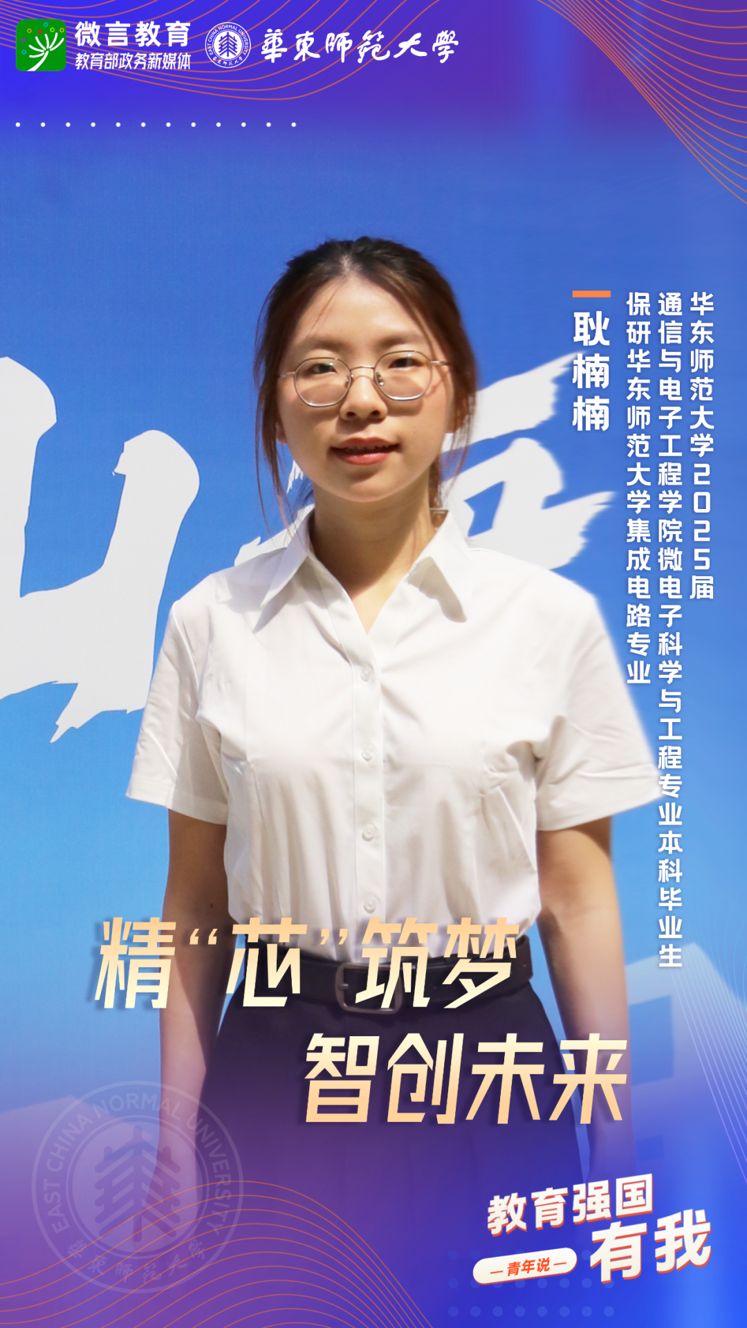 習(xí)近平總書記強調(diào),希望廣大青年堅定理想信念,厚植家國情懷,練就過硬本領(lǐng),發(fā)揚奮斗精神,到祖國和人民最需要的地方發(fā)光發(fā)熱,為中國式現(xiàn)代化建設(shè)貢獻青春力量。教育強國建設(shè),青年何為?教育部政務(wù)新媒體推出“教育強國,有我!”網(wǎng)絡(luò)主題宣傳活動之“青年說(報國篇)”系列,展現(xiàn)青年學(xué)子將個人理想融入國家發(fā)展的青春擔(dān)當(dāng)。今天,跟教育小微通過1個視頻和1組海報,一起來看華東師范大學(xué)學(xué)子如何“向新而行”——