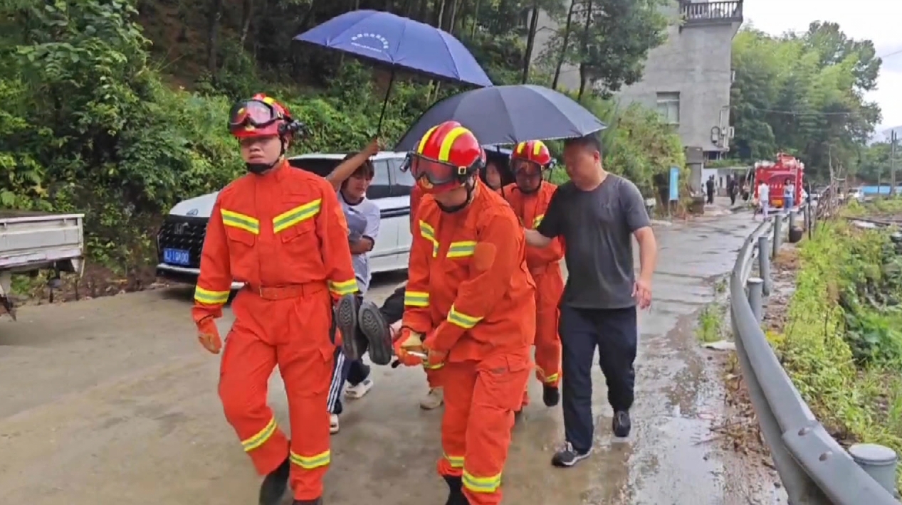 在臺(tái)州黃巖嶼頭鄉(xiāng),轉(zhuǎn)移小組在排查中發(fā)現(xiàn)上鳳村一處地質(zhì)災(zāi)害隱患點(diǎn)居住著一位92歲老人,大家立即取來(lái)?yè)?dān)架將老人慢慢抬出。在大家冒雨接力下,老人被護(hù)送至安置點(diǎn)。