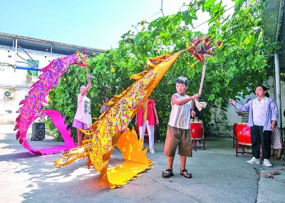 在河南博愛(ài)縣柏山鎮(zhèn)奉義社區(qū),小學(xué)生在縣級(jí)非遺傳承人的指導(dǎo)下學(xué)習(xí)舞彩帶龍。新華社發(fā)
