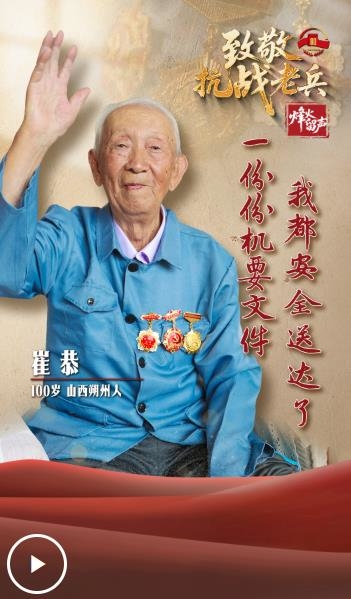 崔恭,100歲,1925年出生在山西平魯縣(今山西朔州市平魯區(qū))一個貧農(nóng)家庭。1942年參加八路軍,隸屬于晉綏分區(qū)新兵連,一個月后被選拔到雁北支隊(duì)通信排任通信員。1943年,雁北支隊(duì)撤銷后,歸屬晉綏軍區(qū)塞北軍分區(qū)警衛(wèi)連通信排,任機(jī)要通信員。1946年參加了解放朔縣城的戰(zhàn)斗。