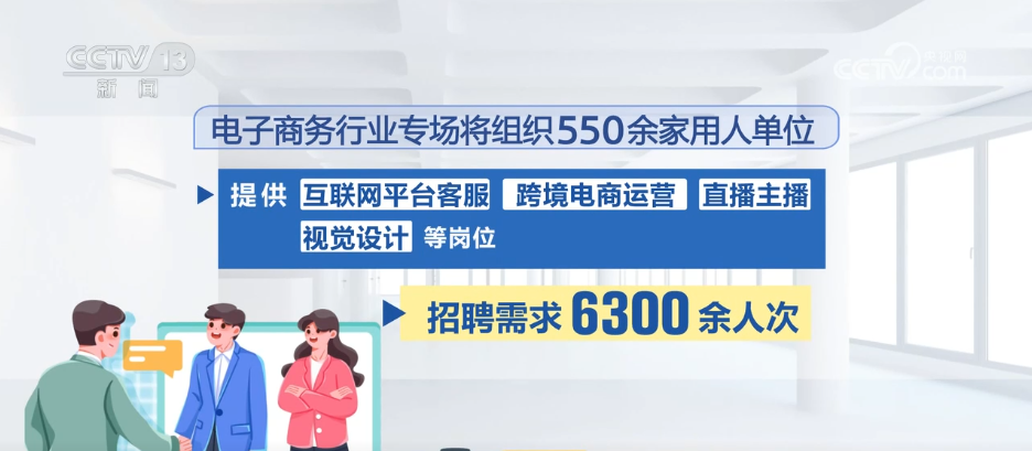 電子商務(wù)行業(yè)專場將組織550余家用人單位,提供互聯(lián)網(wǎng)平臺客服、跨境電商運營、直播主播、視覺設(shè)計等崗位,招聘需求6300余人次。
