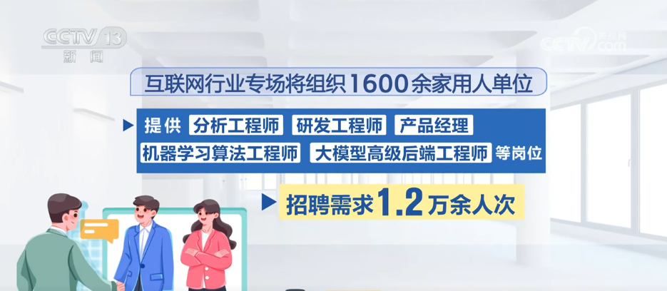 互聯(lián)網(wǎng)行業(yè)專場將組織1600余家用人單位,提供分析工程師、研發(fā)工程師、產(chǎn)品經(jīng)理、機器學(xué)習(xí)算法工程師、大模型高級后端工程師等崗位,招聘需求1.2萬余人次。