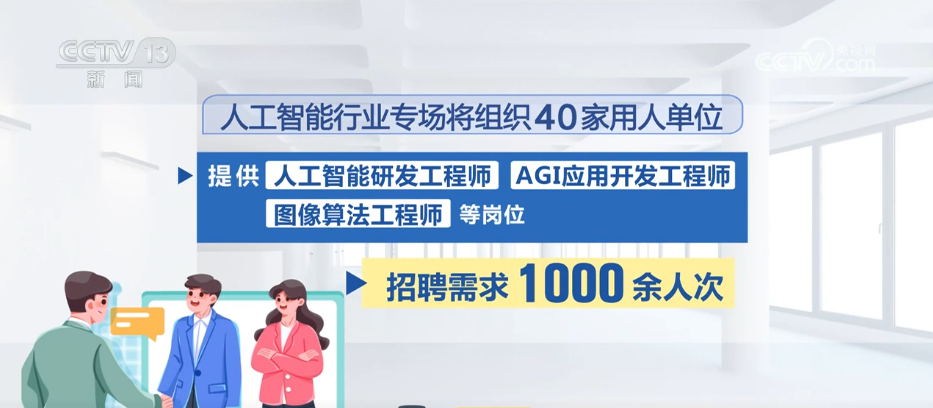 人工智能行業(yè)專場將組織40家用人單位,提供人工智能研發(fā)工程師、AGI應(yīng)用開發(fā)工程師、圖像算法工程師等崗位,招聘需求1000余人次。