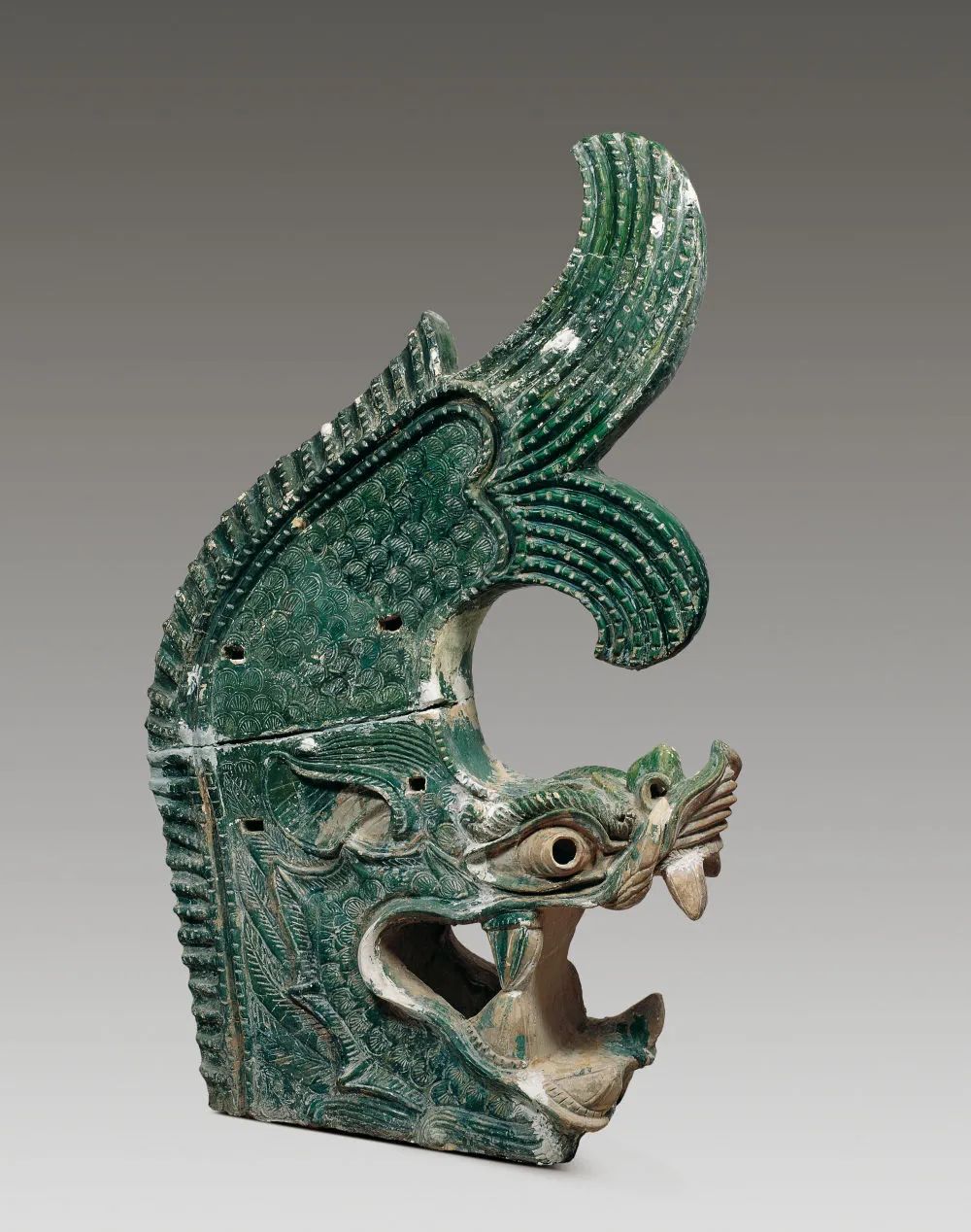 在中國國家博物館“古代中國”基本陳列上,一件出土于西夏陵6號陵的綠釉鴟吻十分顯眼。作為西夏陵的一個(gè)建筑構(gòu)件,它形體高大,既與同時(shí)期中原地區(qū)的鴟吻相似,又具有龍頭比例更大、魚尾分叉等方面的獨(dú)創(chuàng)性。