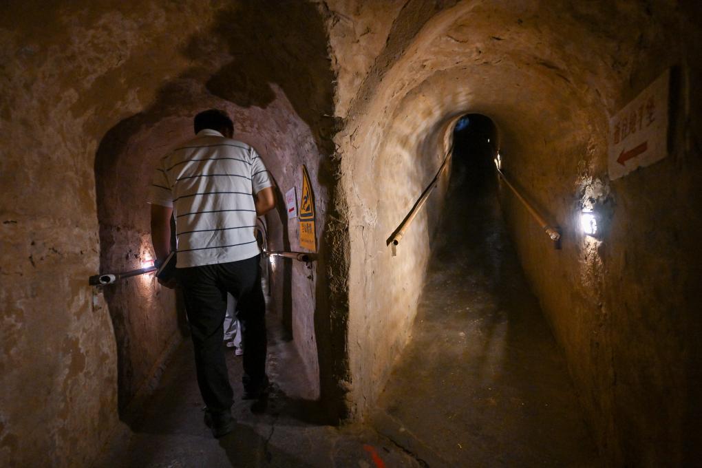 7月6日,游客在冉莊地道戰(zhàn)遺址內體驗鉆地道。新華社記者 李鑫 攝